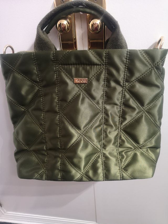 bolso acolchadito, no pesa nada, forrado por dentro con fooro color fucsia, muy chulo el contraste, con ropa estilo militar o verdes queda muy bien