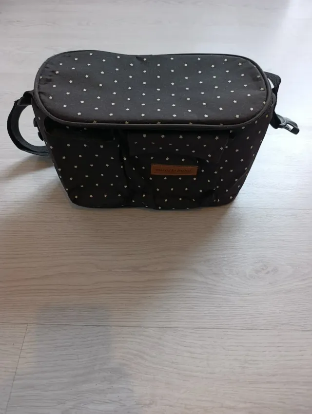 Detalles del productoBolso organizador de la marca Miracle Baby, con un divertido estampado de estrellas blancas sobre fondo oscuro. Es práctico para llevar colgado del cochecito o como bolso de mano.