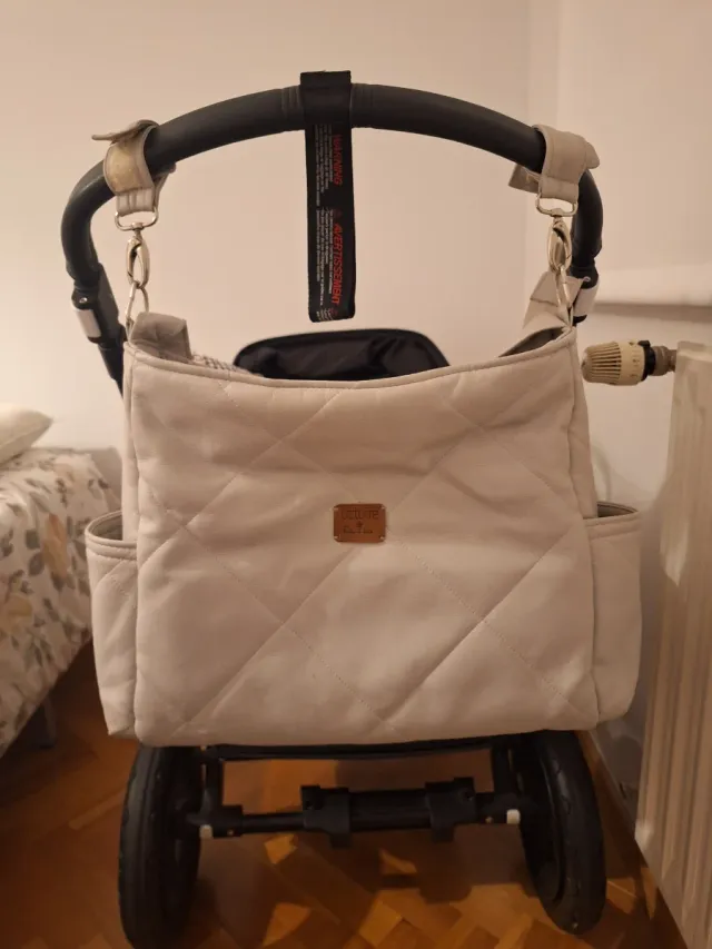 Detalles del productoBolso acolchado con diseño de rombos, ideal para colgar en el carrito de bebé. Cuenta con bolsillos exteriores para un acceso rápido.