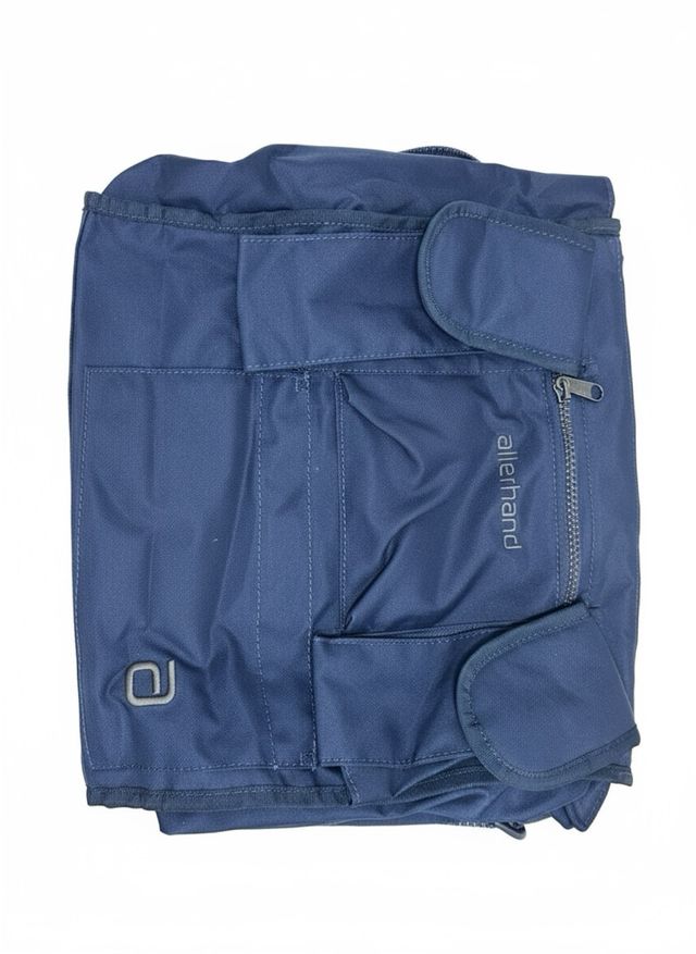Detalles del productoBolso de tela azul para carrito de bebé, con varios compartimentos y un bolsillo con cremallera.