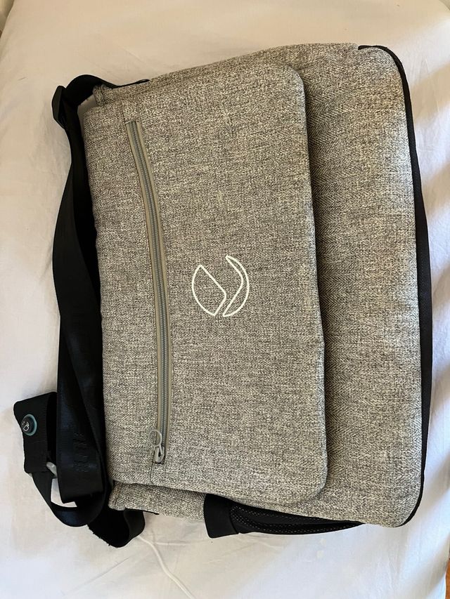 Bolso de tela gris para carrito de bebé. - Diseño moderno con logo blanco. - Cremallera frontal. - Correa ajustable para colgar.