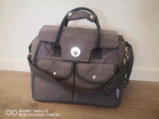 Detalles del productoBolso de tela gris, ideal para llevar todo lo necesario para el bebé durante los paseos en silla.