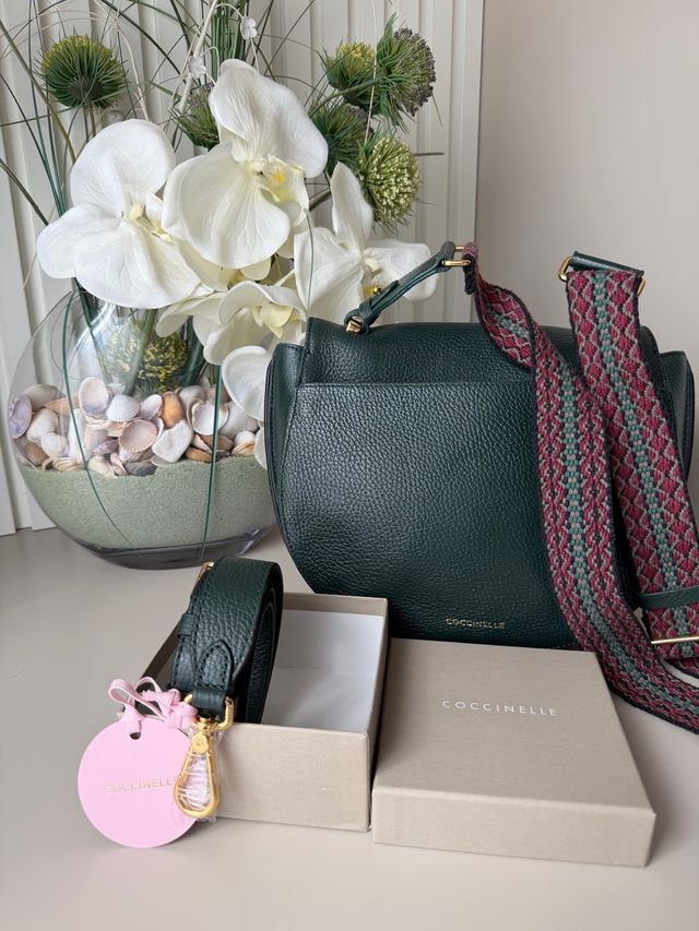 Bolso de piel Coccinelle en color verde. Incluye correa ajustable y detalles en dorado.