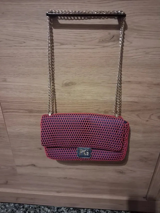 Bolso de mano con un diseño moderno y llamativo. - Exterior de malla en color rosa. - Interior en color azul. - Cadena metálica plateada. - Detalle frontal con logo 'PG'.