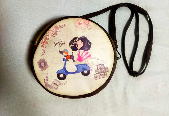 Bolso redondo con un divertido estampado, medidas aproximadas 20 cm de alto y de ancho. - Diseño con niña, perro y moto. - Cierre de cremallera. - Correa ajustable.