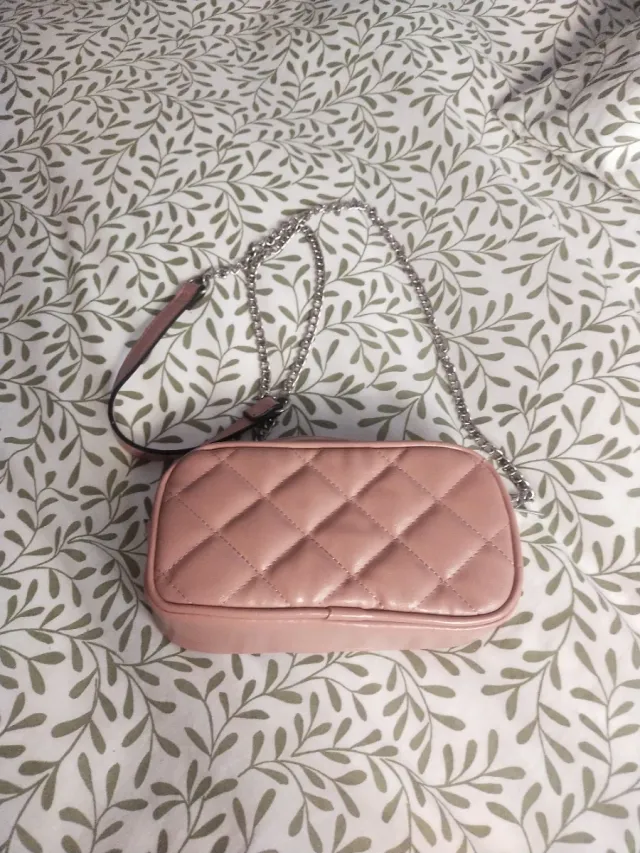 Bolso pequeño con diseño acolchado rosa. Cadena metálica y reforzada en la zona del hombro. Asa de hombro. Cierre con cremallera. Tamaño aproximado ancho 19 cm x alto 10 cm. Sin usar. Marca Stradivarius.