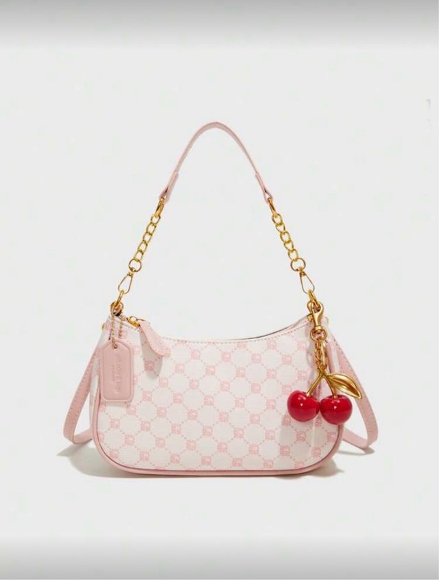 Bolso rosa y blanco con adorno de cerezas
