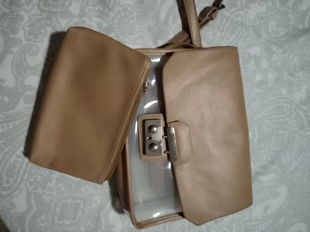 Detalles del productoBolso nude y transparente de stradivarius. Correa tipo bandolera. Carterista de mano extraible incluida, en perfecto estado. El bolso presenta algún desperfecto por el uso (fotos adjuntadas).