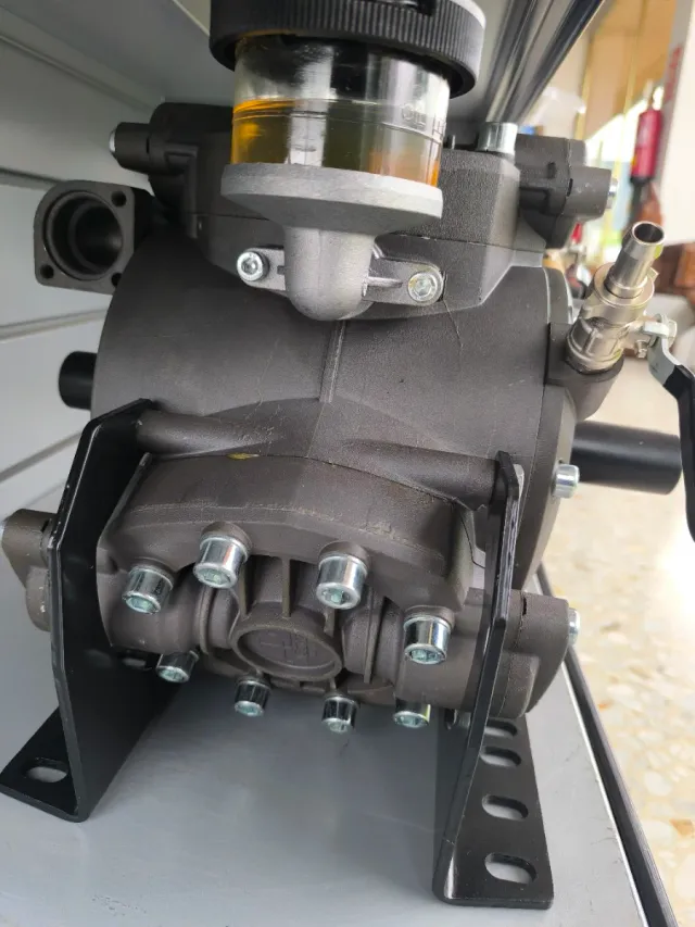 Bomba de atomizador de 120 litros y 50 bar. - Cuerpo de la bomba de fundición. - Depósito de aceite transparente.