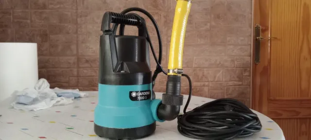 Bomba de agua sumergible Gardena. - Modelo: 7000 S - Color: Azul y negro - Incluye manguera amarilla y cable de alimentación.