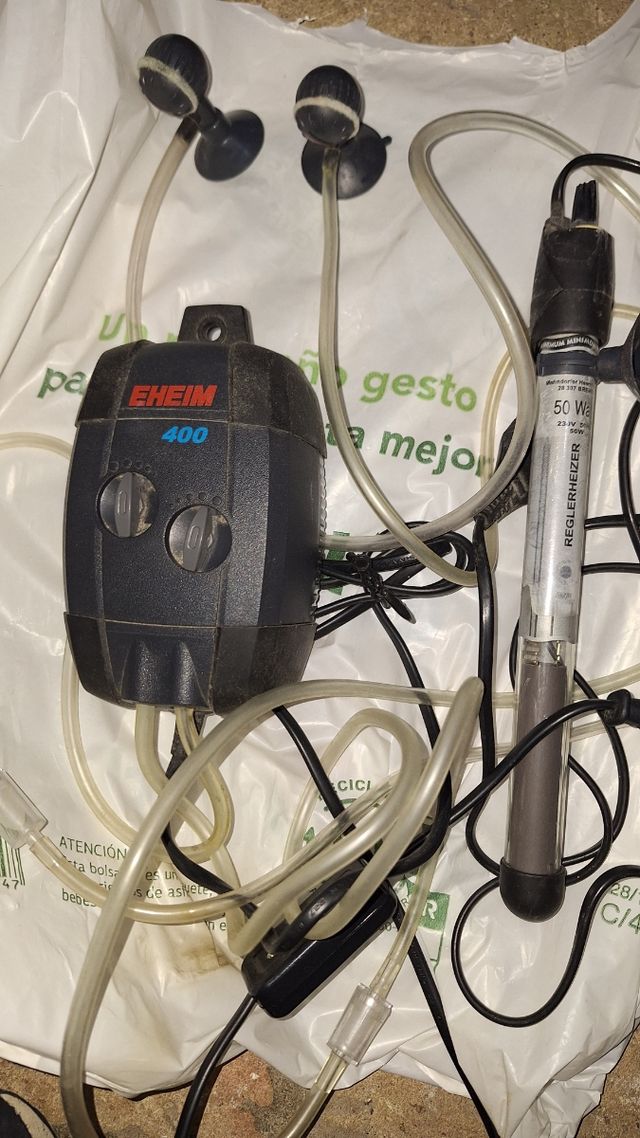 Bomba de aire eheim 400 en buen estado, calentador de 50w y muchas ventosas, se vende todo en 30 euros por Wallapop NO NEGOCIABLE NO RESPONDO OFERTAS.
