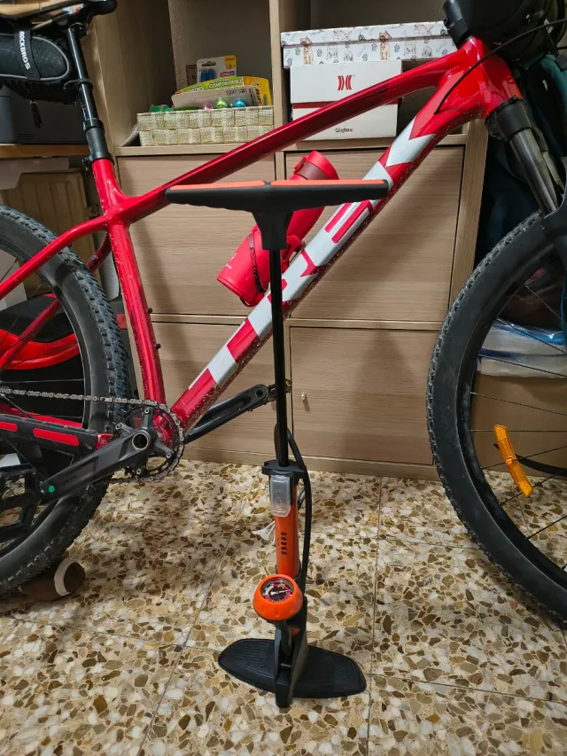 Bomba de aire de pie para bicicletas, con manómetro integrado. - Base ancha para mayor estabilidad. - Mango ergonómico. - Manguera flexible.