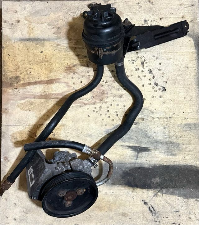 bomba de direccion asistida y deposito para bmw m57d3 330d 325d y alguno mas . Funciona bien pero esta la polea rajada cono se puede apreciar en una de las fotos