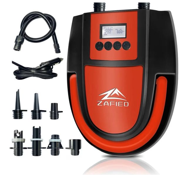 Bomba eléctrica de alta presión para SUP (tabla de surf hinchable). - Voltaje: 12V DC. - Presión máxima: 20 PSI. - Incluye manguera y varios adaptadores de boquilla.