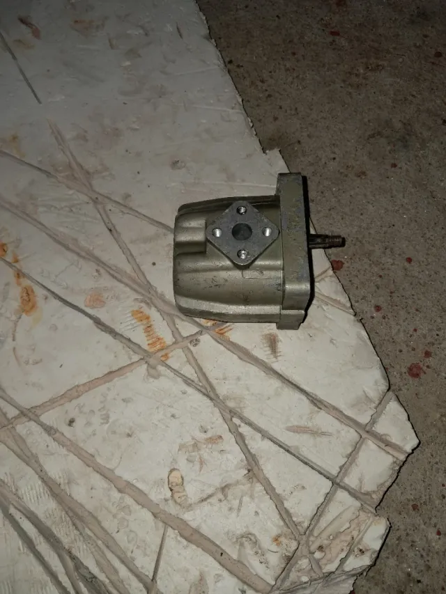 Bomba hidráulica de metal. - Cuerpo metálico con brida de montaje. - Eje de transmisión visible.