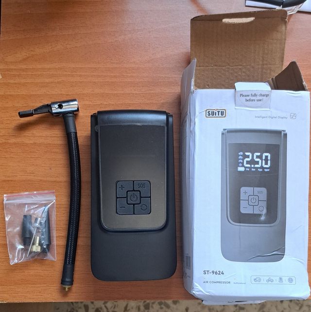 Inflador eléctrico portátil con pantalla digital. - Manguera flexible. - Incluye adaptadores. - Diseño compacto. - También sirve como power bank