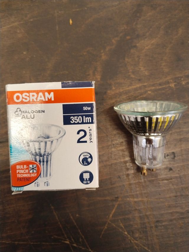 Detalles del productoVendo 40 bombillas halógenas OSRAM de 50W con casquillo GU10. Esta bombilla ofrece 350 lúmenes de iluminación.