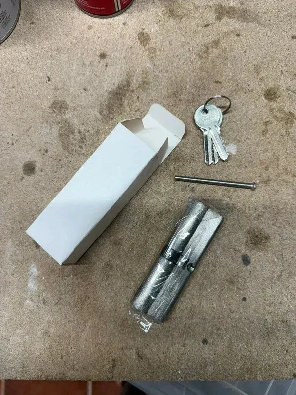 Cilindro de bombín para cerradura, nuevo y sin usar. Medidas 50x50 mm. - Incluye juego de 3 llaves originales. - Incluye tornillo de fijación.