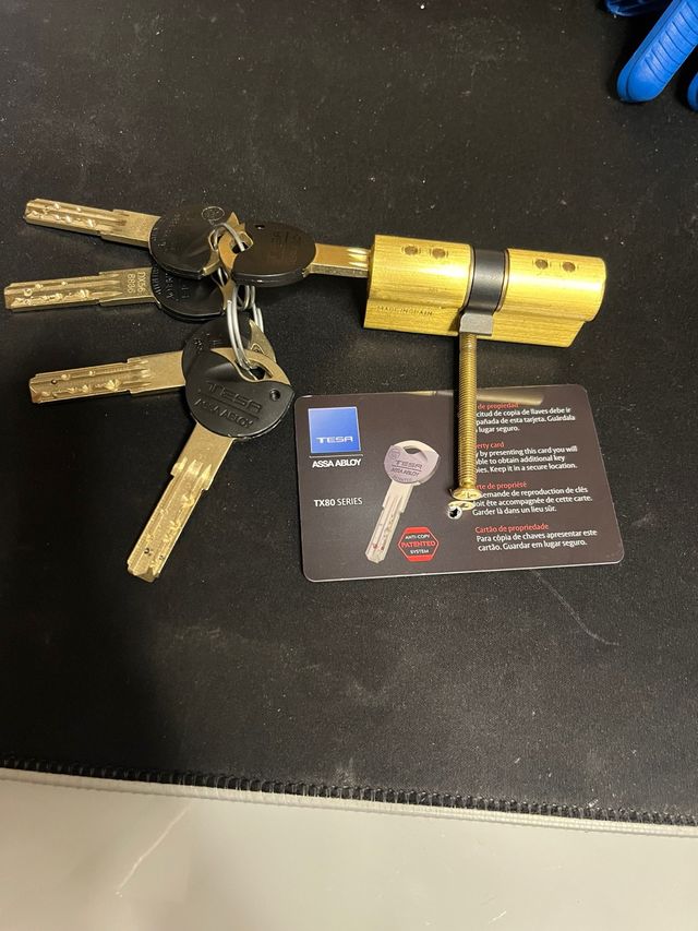 Bombín de seguridad Tesa TX80 en latón. - Medidas: 30x30 mm. - Incluye tarjeta de propiedad para copias de llaves.