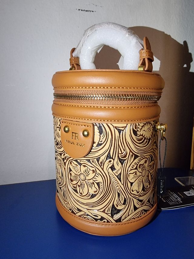 14*18*12cm de piel los dibujos son de leather carving hecho a mano tiene una bandolera larga nuevo perfecto para regalo