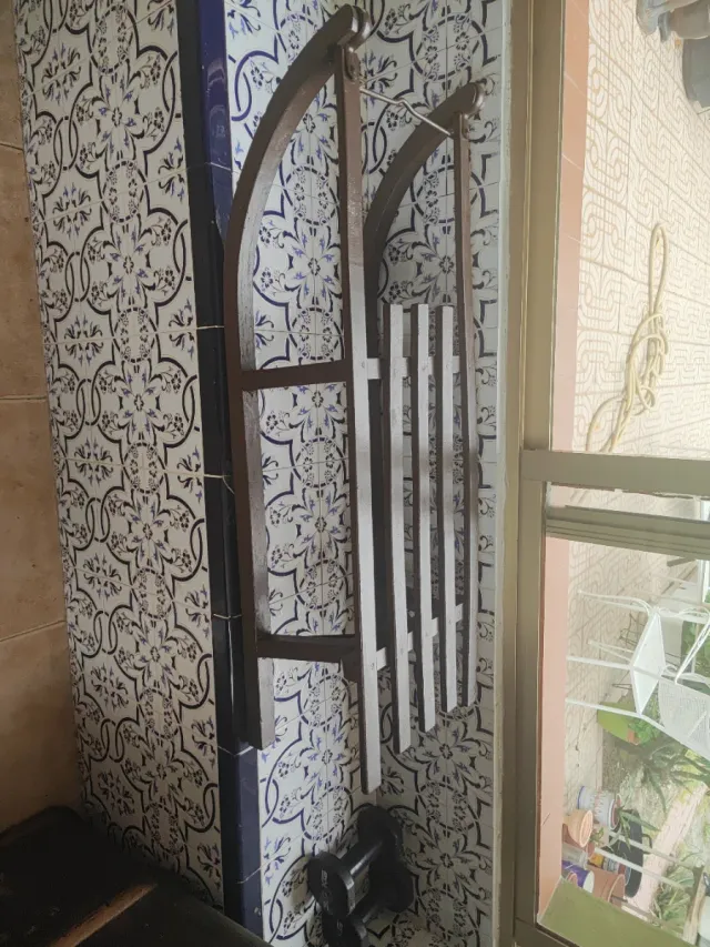 Este bonito trineo está hecho de madera y tiene un diseño curvo. - Estructura de madera oscura. - Diseño curvo en los laterales. - Barras verticales en el centro.