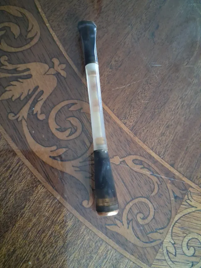 Detalles del productoBoquilla de cigarro antigua, ideal para coleccionistas. En nacarina y metal dorado, en perfecto estado, desmontable en tres piezas, 11cm de largo