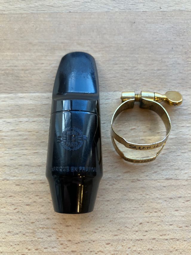 Boquilla para saxofón soprano Selmer S80 C* y abrazadera Selmer SM-B18NL. - Boquilla de ebonita. - Abrazadera de metal dorado.