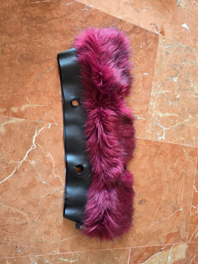 - Combina cuero negro con detalles de pelo sintético en color rosa.