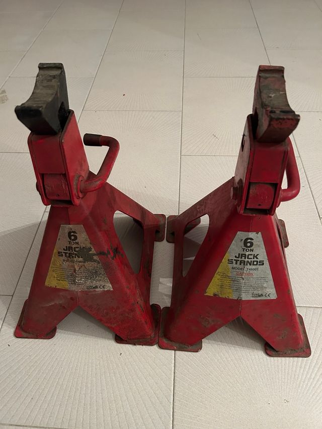 Detalles del productoPar de borriquetas o caballetes de 6 toneladas de capacidad. Ideales para soportar vehículos Todoterreno 4x4 o turismos de forma segura.
