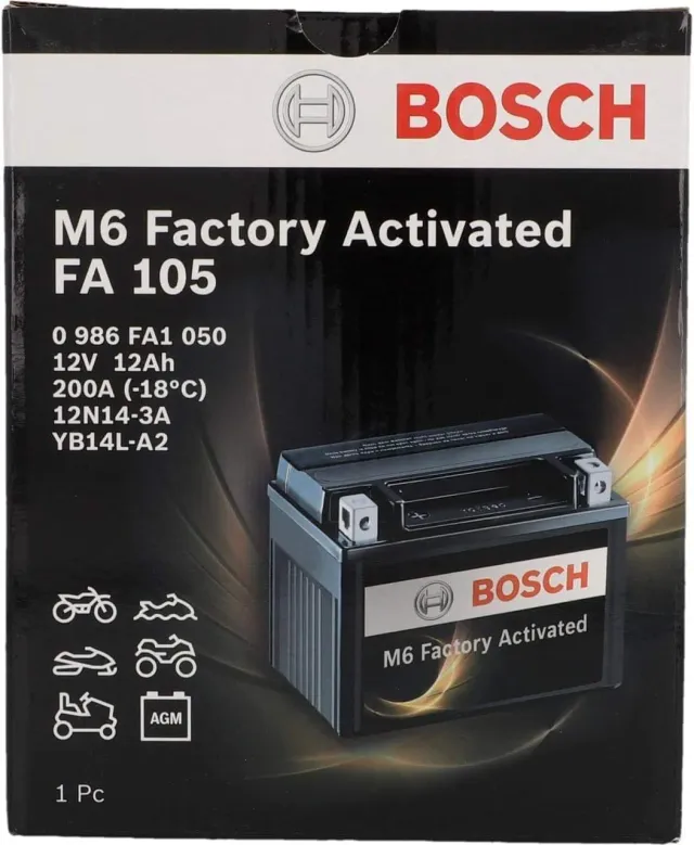 Bosch FA105 - Batería para Motocicletas AGM 12V 210A 12Ah, para motocicletas, motos de enduro, scooters, quads, motos de agua,Compatible M4F34, M4F36, BTX14AHL-BS, BB14L-A2, BB14L-B2, 12N14-3A