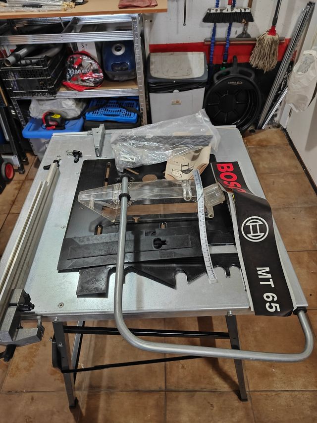 Está sin usar con todos los accesorios, se sacó de la caja, se montó y no sé ha usado. Manual de instalación y todos los accesorios. Con guías y reglas para corte preciso. Es muy estable y de calidad. Nueva costaba más de 300 euros. Las pegatinas están son poner.