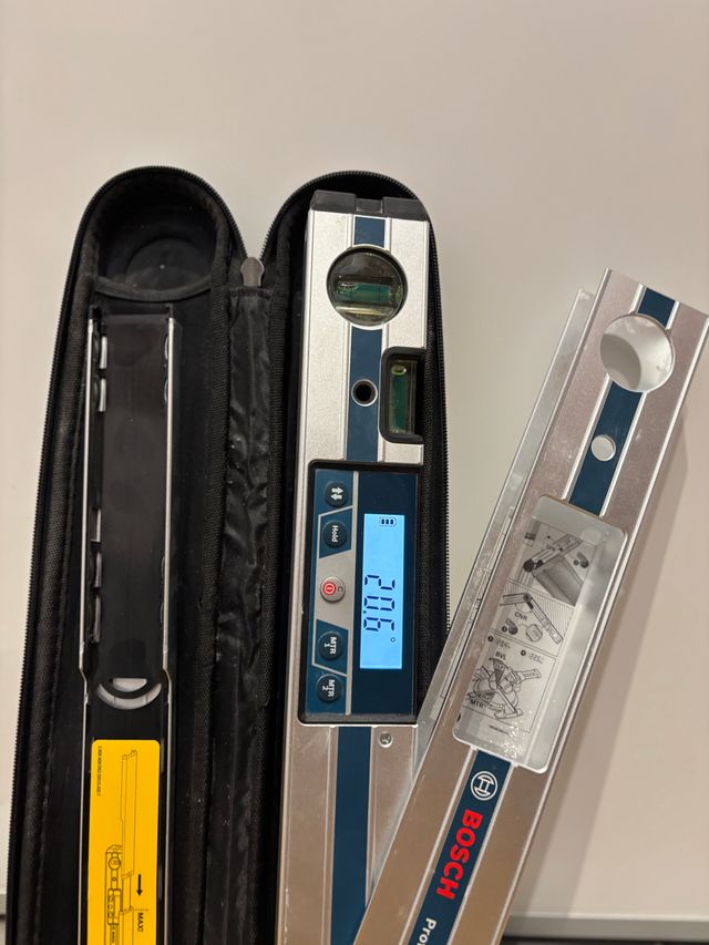 Detalles del productoBosch profesional, medidor digital de ángulos GAM 220 MF ( Cálculo de ángulos de Inglete, margen de medición de 0° a 220° longitud 40cm. Abierto a 180° 80cm de nivel por que también tiene burbuja y puede usarse como nivel vertical u horizontal. IP54