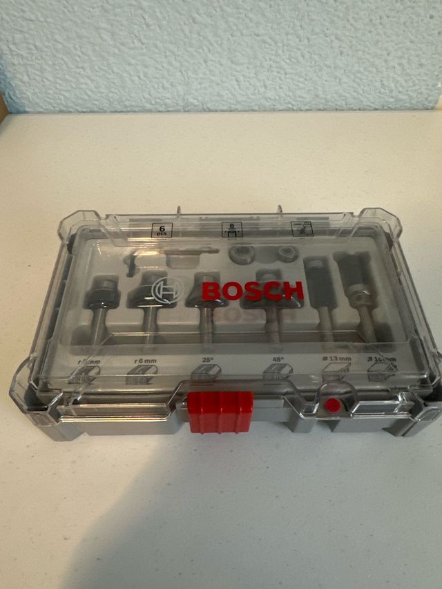 Detalles del productoSet de 6 brocas fresadoras de la marca Bosch, presentadas en un práctico estuche.