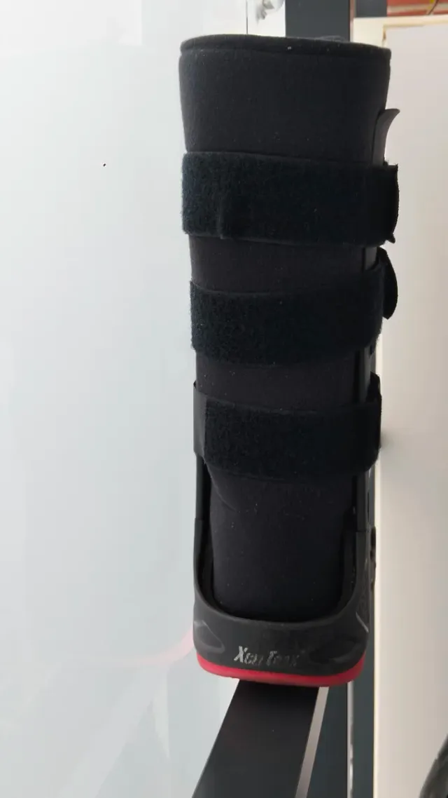 Bota ortopédica alta en talla M. Diseñada para brindar soporte y comodidad. - Cierre con velcros ajustables. - Material exterior negro. - Suela con detalle rojo.