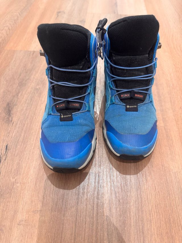 Detalles del productoBotas de montaña Adidas Terrex para niño en color azul. Tienen poco uso aunque si que tienen cierto desgaste ( las ha usado tres meses en acampadas ) aún se les puede dar muchísimo uso. PVP nuevas 70 Euros