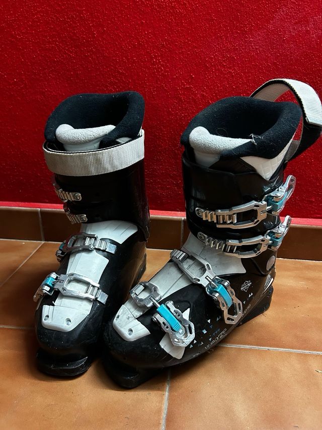 Botas de esquí para adulto. - Cierre con 4 ganchos. - Correa de velcro superior. - Diseño en negro y blanco con detalles azules.