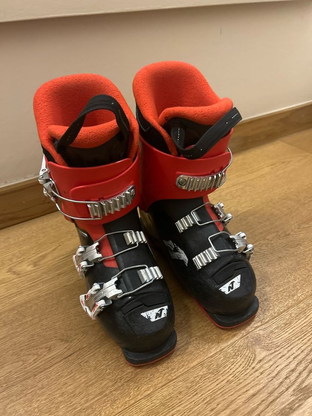 Botas de esquí infantiles en color negro y rojo. - Talla 20-20.5. - Longitud de suela de 245 mm. - Cierres de hebilla metálica.