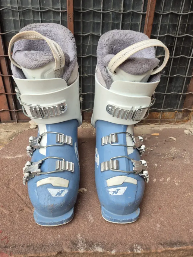 Detalles del productoBotas de esquí NORDICA de color azul y blanco, diseñadas para niñas. Cuentan con un forro interior suave y gris para mayor comodidad.