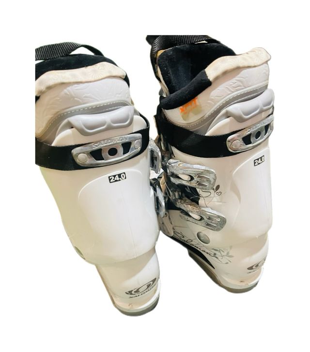 Botas de esquí Salomon en color blanco, talla 24.0. - Cierre con hebillas. - Detalle de flores y hojas. - Marca Salomon visible.
