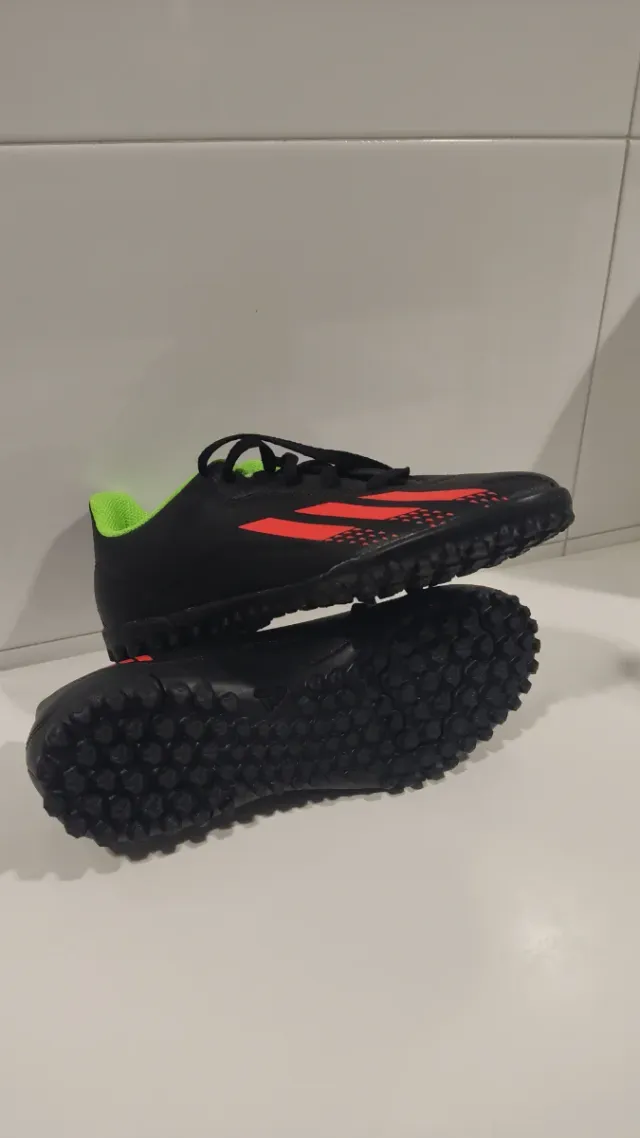 Detalles del productoBotas de fútbol Adidas número 35 y medio, en color negro con detalles en rojo y verde neón. Diseñadas para césped artificial. Nuevas a estrenar.