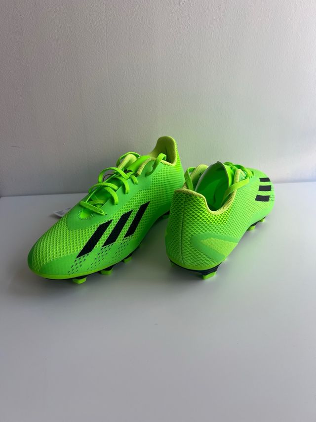 Botas de fútbol Adidas en llamativo color verde neón. Completamente nuevas, nunca fueron usadas. Talla 43. - Diseño deportivo. - Tres rayas icónicas de Adidas en negro.