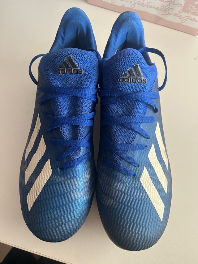 Botas de fútbol Adidas en color azul. - Diseño con las tres rayas blancas. - Cierre de cordones.