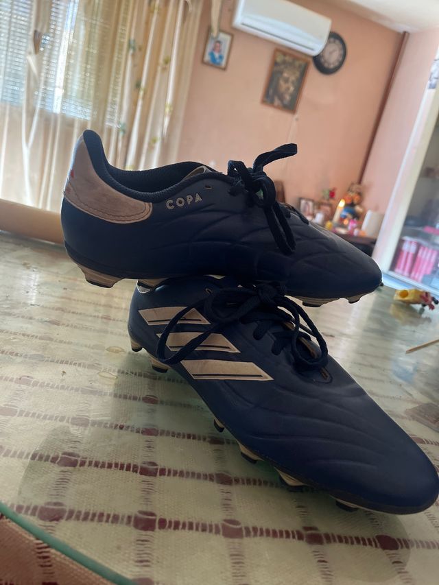 Botas de fútbol Adidas Copa en color azul marino. - Diseño clásico con detalles en blanco. - Cierre con cordones. - Suela con tacos para césped.