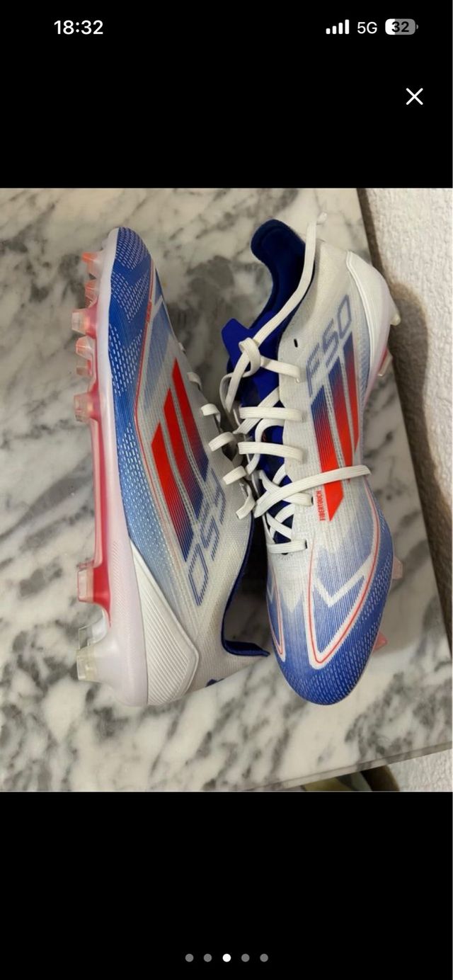 Botas de fútbol Adidas F50 gama PRO. - Diseño en blanco, azul y rojo. - Cierre con cordones blancos. - Suela con tacos para césped.