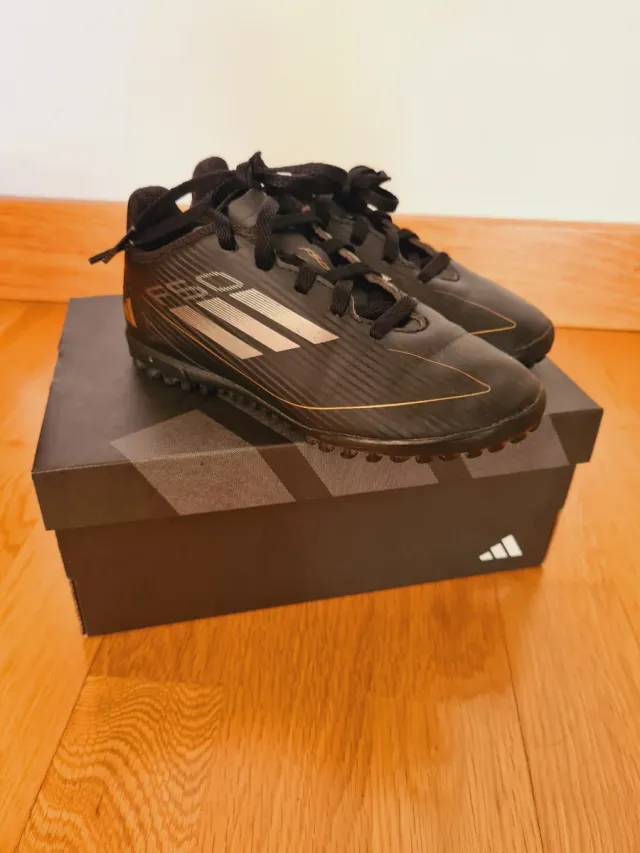 Botas de fútbol Adidas F50 multitacos. En color negro con detalles en dorado. Talla 30.