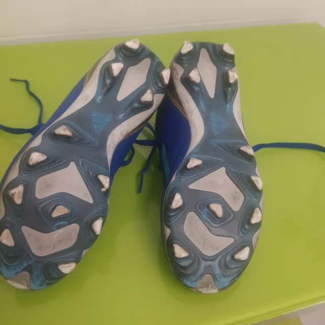 Botas de fútbol de tacos para niño de la marca Adidas. - Talla 33. - Color azul con detalles dorados y blancos. - Suela con tacos para césped.