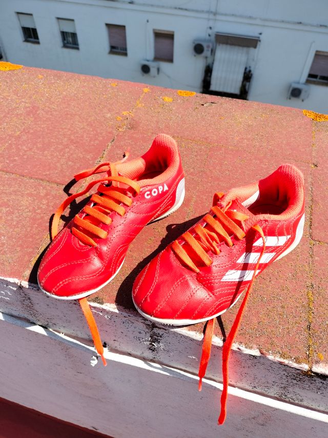 Botas de futbol niño. Equivalen a un 28. Marca Adidas. Color Rojo. Están en muy buen estado. Punteras talón suela...nada saltado ni roto. De cordones.