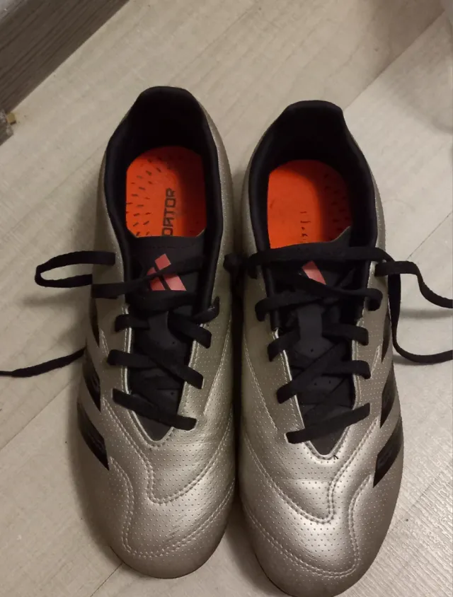 Botas de fútbol Adidas Predator en color plateado y negro. Talla 38 - Diseño deportivo. - Cordones negros. - Suela con tacos.