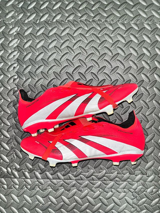 Botas de fútbol Adidas Predator color rojo y blanco. - Diseño deportivo. - Tacos para césped. - Logo de Adidas.