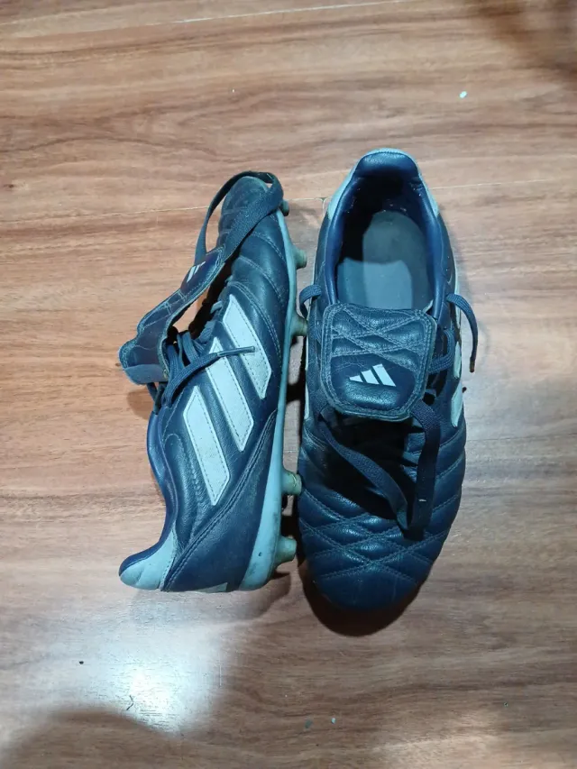 Botas de fútbol Adidas en talla 40. Se encuentran en buen estado. - Color azul marino con detalles en gris. - Cierre de cordones. - Tacos para césped.